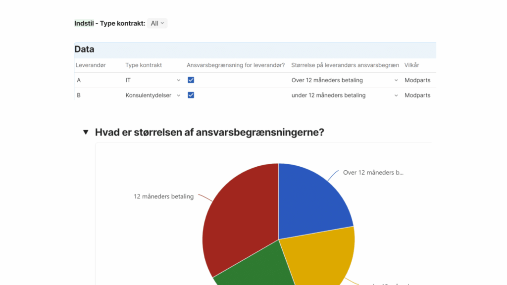 Med en tracker, selv i lille målestok, får man et hurtigt overblik, så man eksempelvis kan se om man normalt går med til ansvarsbegrænsning for leverandøren, brudt ned på typen af kontrakt, samt hvor stor den i givet fald er.